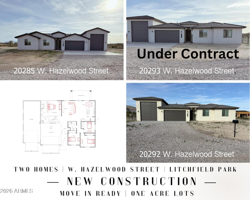 Listing details for 20292 Hazelwood St, Litchfield Park, AZ 85340 : Welcome to 20292 W Hazelwood Street a single family home move in ready. See the one other newly constructed residence available on 20285 W Hazelwood offered at $650,000. Each home sits on approximately one acre and features a fully fenced backyard, an attached RV garage, and a shared well serving all four properties. Construction has just been completed and all homes are move-in ready.