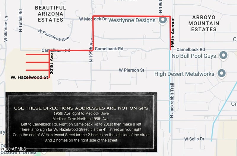 Listing details for 20293 Hazelwood St, Litchfield Park, AZ 85340 : Welcome to 20293 W Hazelwood Street a single family home move in ready. See the three other newly constructed residences available on 20285, 20284, and 20292, each offered at $650,000. These homes are also available as a rent with option to buy. USE THESE DIRECTIONS ADDRESSES ARE NOT ON GPS....195th Ave right to Medlock Drive. Medlock Drive to 199th Ave. then left to Camelback Rd. Right on Camelback Rd to 201st then make a left. There is no sign for W. Hazelwood, it is the 4th street on your right and go to the end of W Hazelwood for the four homes. 2 on one side and 2 on the other of W Hazelwood St. Each home sits on approximately one acre and features a fully fenced backyard, an attached RV garage, and a shared well serving all four properties. Construction has just been completed and all homes are move-in ready. The open floor plan offersBuyer to verify all information deemed material to Buyer and conduct Buyer's own due diligence and investigations regarding the property. Information provided is deemed reliable but not guaranteed.