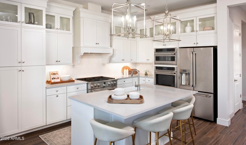 Listing details for 20315 Montetico Ave, Buckeye, AZ 85396 : Experience refined 55+ living at Victory at Verrado, where resort-style amenities and community define everyday life. The beautifully Clyde plan features designer-selected finishes and a layout built for comfort & ease. The gourmet kitchen showcases a spacious island, marble-look quartz counters, maple-stained cabinets and GE Profile stainless steel appliances with a wall oven. The open great room, accented by a coffered ceiling, creates a warm and inviting space that flows effortlessly to a covered patio and landscaped backyard for true indoor-outdoor living. A flexible home office adds room for work, wellness, or hobbies, while the private primary suite offers a peaceful retreat with a dual vanity, step-free shower, and walk-in closet.