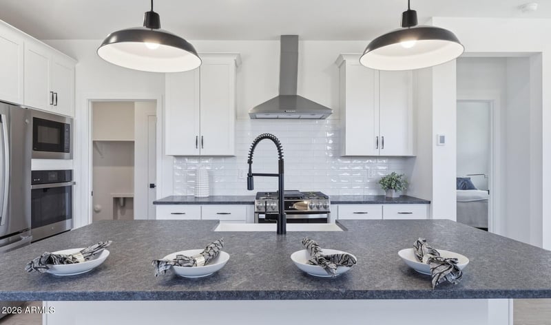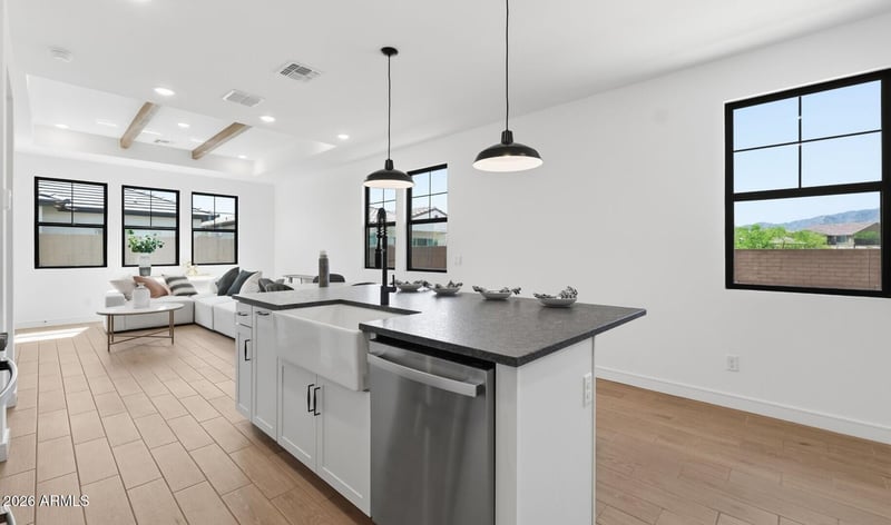 Listing details for 20373 Campbell Ave, Buckeye, AZ 85396 : ~Special CASH Pricing Available $374,990~ Live life to the fullest at K. Hovnanian's Four Seasons at Victory at Verrado, an exceptional 55+ active adult community designed for resort-style living. The beautifully crafted Calder floorplan showcases Farmhouse-inspired, designer-curated interior selections throughout. The well-appointed kitchen features a large island with pendant lighting, Steel Grey quartz countertops, white cabinetry with 42-inch uppers, and GE Profile stainless-steel appliances, making it ideal for everyday living and entertaining. The stunning primary suite features a spa-like bath, dual vanities, and a no-step shower with bench seating for comfort and accessibility. Thoughtfully designed, this inviting home offers the perfect blend of style and convenience.