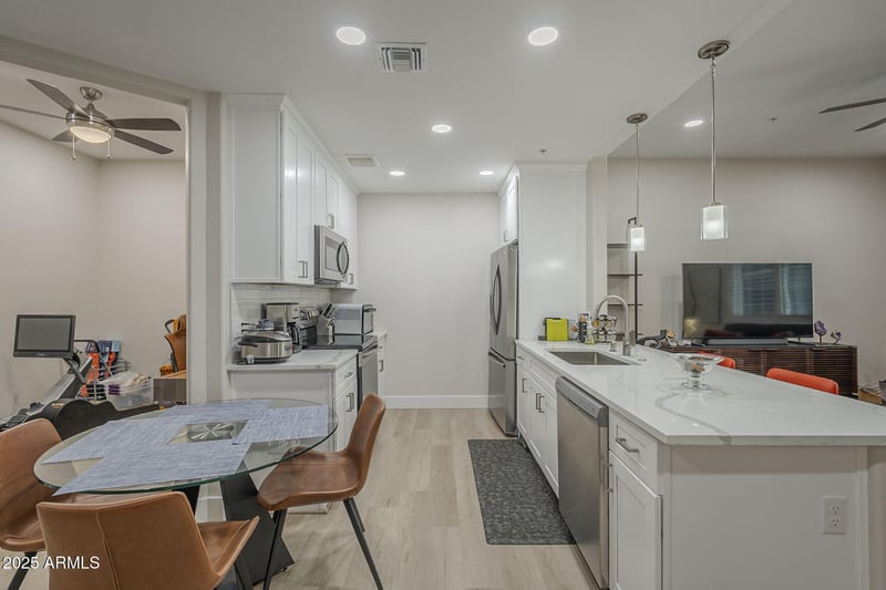 Listing details for 2038 River Rd #101, Tucson, AZ 85718 : Discover comfort and convenience in this charming 1-bedroom, 1-bath condo with a den, perfectly situated at the sought-after corner of River and Campbell! The home offers direct Riverwalk access and walkability to top-tier dining, boutique shopping, and vibrant local businesses. This cozy yet stylish unit features smooth vinyl flooring throughout and a modern kitchen complete with white shaker cabinets, stone countertops, and a welcoming breakfast bar--ideal for casual meals or entertaining. With thoughtfully selected designer finishes, this is an unbeatable opportunity to own in one of the city's most desirable locations!