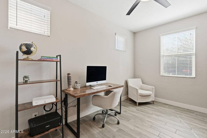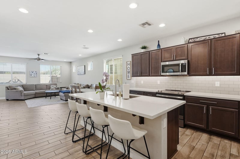 Listing details for 20410 Domingo Rd, Queen Creek, AZ 85142 : Welcome to Victoria Heights, a community minutes to Queen Creek Marketplace..This home offers upgraded wood plank flooring, quartz counters & stainless steel appliances. Large laundry room leads to a flex room. Full bathroom and bedroom located downstairs.Upstairs find a loft and 4 more bedrooms with 2 full baths.Primary bedroom is split from others and offers large walk-in shower & closet. All bedrooms are great sizes with one offering a walk-in closet as well.Storage closets throughout. Ceiling fans, faux wood blinds, additional insulation, tankless water heater, epoxy floors in garage, and more features to discover.Backyard offers extended paver patio, turf yard and dog run. Tall baseboards, two tone paint, alarm system, the features are too many to list!