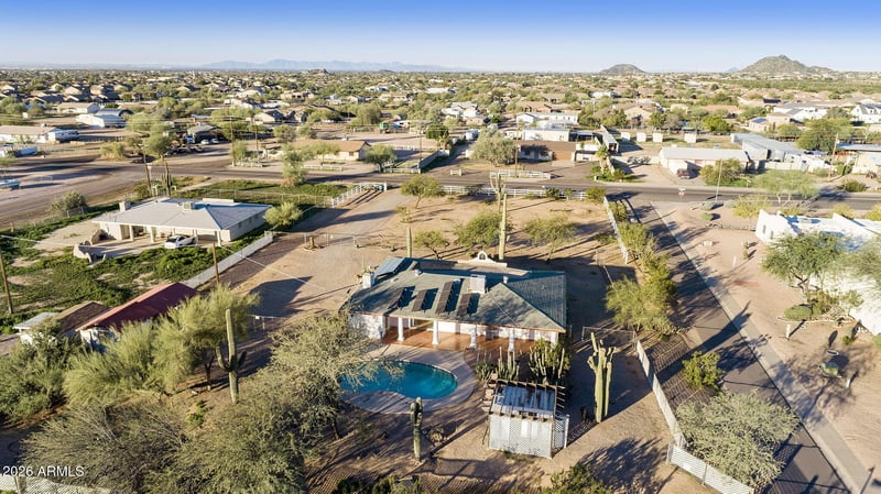 Listing details for 2053 Meridian Rd, Apache Junction, AZ 85120 : GORGEOUS Mountain Views and NO HOA!!! This BEAUTIFUL home features 2 spacious bedrooms and 3-bath rooms. The kitchen features granite counter tops, multiple built-in ovens, breakfast bar and tons of storage and counter space. Check out the large family room with a fireplace and built in shelving and sits on over an acre of usable land, offering exceptional space, flexibility, and privacy! Enjoy stunning views of the Superstition and Goldfield Mountains from your vast backyard, complete with a pool, covered patio, storage shed, and workshop. Perfect for outdoor living and endless possibilities. Don't miss this amazing deal!