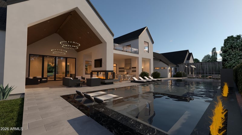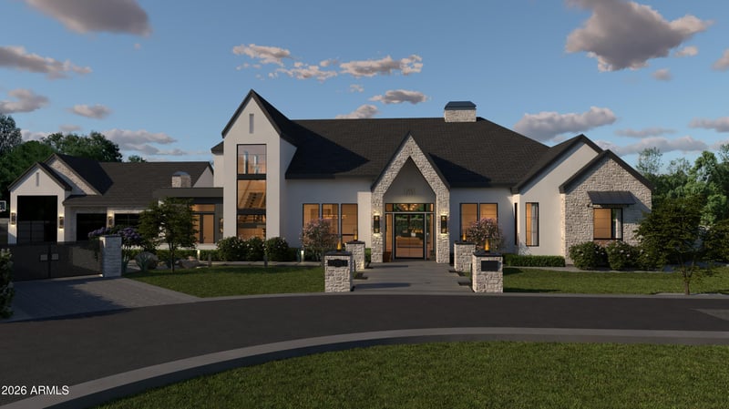Listing details for 20553 Pecan Ln, Queen Creek, AZ 85142 : Welcome to The Pecans in Queen Creek -- a brand-new custom spec home delivering October 2026 with over 8,000 square feet of meticulously designed living space. This two-story contemporary farmhouse blends natural stone and smooth stucco with black steel-framed windows, dramatic rooflines, and an architectural presence that commands attention from the moment you pull into the paver motor court.