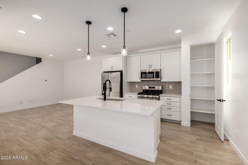 Listing details for 20612 Thomas Rd, Buckeye, AZ 85396 : Explore this Boston model home, ready for quick move-in! Included features: a covered front porch; an elegant great room; a well-appointed kitchen offering quartz countertops, stainless-steel appliances, a center island, and an open dining area; a convenient powder room; an inviting primary suite showcasing a roomy walk-in closet and a private bath with double sinks; two secondary bedrooms with a shared hall bath; an upstairs laundry with stacked machines; and a serene covered patio. This home also boasts airy 9' ceilings throughout and cultured marble bathroom countertops.
