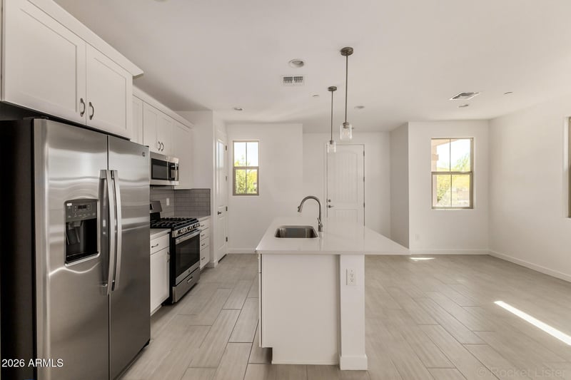 Listing details for 20618 Thomas Rd, Buckeye, AZ 85396 : Explore this Chicago home, ready for quick move-in! Included features: a covered front porch; an elegant great room; a well-appointed kitchen offering quartz countertops, stainless-steel appliances, a center island, and an open dining area; a convenient powder room; an inviting primary suite showcasing a roomy walk-in closet and a private bath with double sinks; two secondary bedrooms with a shared hall bath; an upstairs laundry with stacked machines; and a serene covered patio. This home also boasts airy 9' ceilings throughout and cultured marble bathroom countertops