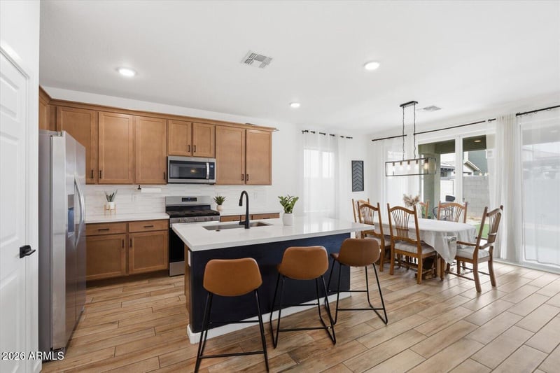 The kitchen showcases quartz countertops, upgraded cabinetry with hardware, and a deep-fill stainless steel sink paired with a modern black faucet. Custom tile flooring accents the powder room, while the guest and primary bathrooms offer square sinks, dual vanities, and stylish black fixtures. The primary suite includes a huge walk-in shower, and the upstairs loft provides the perfect space to unwind while taking in beautiful Arizona sunsets.