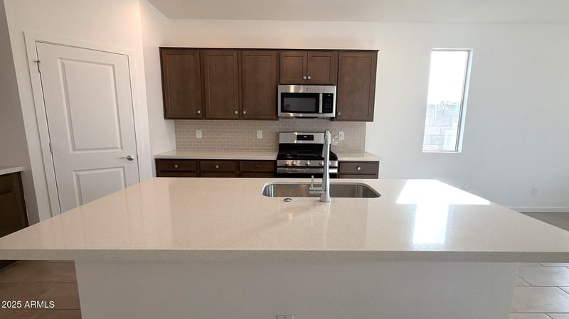 Listing details for 20680 224th Ave, Surprise, AZ 85387 : Amazing OPPORTUNITY! Home is READY! Energy efficient home in the DESIREABLE Frontera community with so much to offer. Stunning views! Great curb appeal, stone elevation, 8' garage door, garage service door, soft water loop, big yard, extended covered patio and on a corner lot! Smart Home package, ceiling fan prewires in all bedrooms and great room too. Spacious kitchen has large island with breakfast bar, single bowl sink and a walk-in pantry. The quartz countertops are beautiful, backsplash included, Benton Burlap cabinets, chrome hardware and finishes throughout. Dining area for family dinners. Carpet only in bedrooms/closets, 12''x24'' tile everywhere else! Split floor plan, four bedrooms, 2.5 baths. Beautiful parks, pickleball, Bocce ball and more. You will want to come see today!