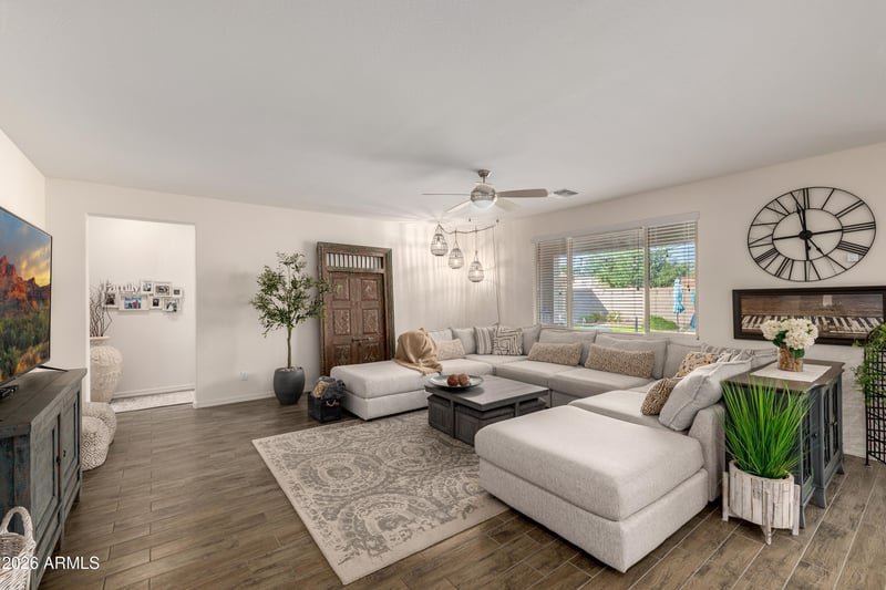 Listing details for 20681 Danielle Ave, Maricopa, AZ 85138 : Stunning Home with over $140K in improvements and upgrades!! Exceptional functionality with a 3-car attached garage, RV gate, dedicated RV parking & detached workshop. Stunning foyer leads into an open layout designed for comfortable living, effortless entertaining & upgrades. The kitchen showcases a breakfast bar island, SS appliances, granite counters, a walk-in pantry, & beautiful cabinetry w/crown molding. The Primary bedroom offers a bathroom including dual sinks, a separate tub/shower, & a large walk-in closet. Entertainer's dream backyard with resort-style landscape/hardscape, putting green, paver patio, sparkling blue solar-heated pool, & covered patio. Save money: $17K owned outright solar panels provide energy efficiency for the home.