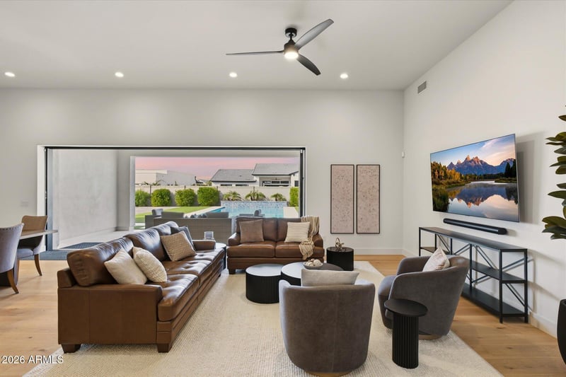 Listing details for 20728 Indiana Ave, Queen Creek, AZ 85142 : Welcome to this exceptional Toll Brothers Rio Verde home on a desirable premium interior lot on a third of an acre in the gated Bridle Ranch community. Offering 4,200 sq ft of thoughtfully designed single-level living, this residence features 4 bedrooms, 3.5 bathrooms, 2 living spaces, and a private attached casita with separate entrance, and a 3-car garage -- seamlessly blending luxury, comfort, and functionality. The striking Desert Contemporary architecture and professionally designed landscaping create timeless curb appeal. Inside, the home showcases clean lines, a sophisticated palette, natural hardwood flooring, and elevated finishes throughout -- striking the perfect balance between warmth and modern elegance. The gourmet kitchen serves as the heart of the home, featuring navy... cabinetry, quartz countertops, premium stainless steel appliances, including a 6-burner gas cooktop, double wall oven and oversized refrigerator, a large walk-in pantry, and an impressive 14-foot island ideal. The great room impresses with 12' ceilings and a dramatic 20' multi-slide pocket glass door, creating seamless indoor-outdoor living. The primary suite offers a private retreat with a massive walk-in closet and spa-inspired bath complete with dual marble-topped vanities, an large walk-in shower, and a soaking tub. Secondary bedrooms are generously sized and connected by a Jack-and-Jill bath. A spacious bonus room provides flexibility for a media room, playroom, or home gym. Additional flex spaces can easily function as a home office, formal dining room, or creative studio. The attached casita with its own entrance, bedroom, full bath, and sitting area offers exceptional versatility for guests, multigenerational living, or a private workspace. Designed for year-round enjoyment, the backyard is a true retreat. The covered patio extends everyday living outdoors, overlooking a custom 34' x 17' pool, elegant travertine walkways, artificial turf, and lush landscaping. For added convenience and efficiency, the garage is equipped with two EV chargers. Residents of Bridle Ranch enjoy access to community amenities including a playground, bocce ball courts, social gathering spaces, and scenic walking and biking paths. Ideally located near Queen Creek Marketplace and San Tan Mountain Regional Park, this home offers convenient access to Queen Creek's ever-expanding collection of shopping, dining, and entertainment. This is refined desert living at its finest--where thoughtful design, premium finishes, and an exceptional setting come together beautifully.