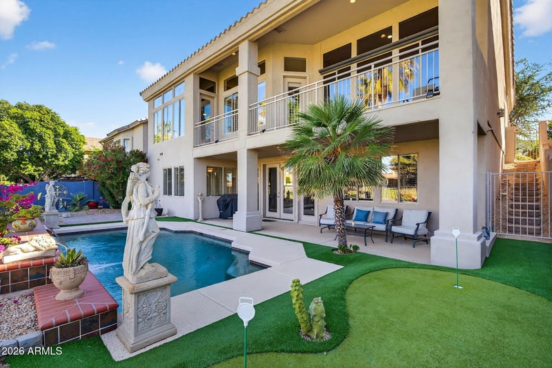 Listing details for 20764 56th Ave, Glendale, AZ 85308 : HUGE PRICE DROP (BELOW COMPS)! Gorgeous home in Arrowhead Lakes backing to the Legends Golf Course! Enjoy expansive views of the golf course, and ever changing sunsets from your own home. Mountain views too! This 4BR residence, plus office and bonus room, has a stunning resort backyard, bright, elegant living spaces with tall ceilings, plantation shutters, and electric sunshades. The spacious formal LR/DR upstairs has wood flooring, a gas fireplace and access to the large balcony. The eat-in kitchen features granite countertops, SS appliances, 5 burner gas cooktop, and a center island. The primary bedroom includes balcony access & an ensuite bath with a dual vanity, jetted tub, and large walk-in closet. Newer misting system on both balcony and lower patio to keep you cool in the summer Downstairs you'll find 3 bedrooms, and 2 full bathrooms, a bonus hobby room, and a large family room with wet bar opening to pool and backyard, making it ideal for entertaining or house guests. Plenty of extra storage closets on lower level for all your seasonal decor and extras. Enjoy golf course views or relax in your serene backyard with pool with water feature, covered patio, and your own putting green. You'll enjoy the Arrowhead Lakes community for it's beautifully landscaped common areas and lakes, sidewalks and mountain views, perfect for spending time outdoors. Just down the street from your home is a massive park with picnic ramadas, shaded playgrounds, large grass areas, sand volleyball and basketball. Dining and shopping options abound just outside the neighborhood. Fantastic location with easy access to the AZ-101 and I-17 freeways.