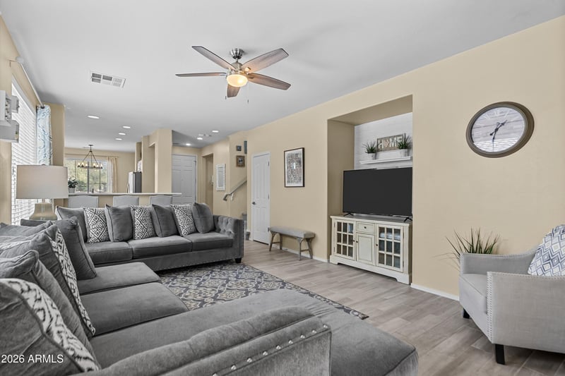Listing details for 21013 Aldecoa Dr, Queen Creek, AZ 85142 : Absolutely immaculate nicely upgraded/updated 3 bed 2 1/2 bath home with a main floor primary bedroom in the beautiful Ocotillo Landing neighborhood. Updated wood plank look tile floors on the main floor. Kitchen has newer cabinets, stainless appliances, updated Quartz counters and lots of cabinets. Primary bathroom and upstairs bathroom has Quartz counters, newer sink, faucet, mirror. Spacious great room with sliding glass door to the covered patio and fully fenced private backyard. Nicely landscaped Southern facing backyard with turf and mature landscaping for the utmost in privacy. Wonderful community with pool, hot tub, ramada, picnic table and restrooms plus a playground. Close to shopping & restaurants,