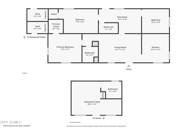 Listing details for 2103 Silverton St, Mesa, AZ 85203 : Fully Updated and charming income-producing manufactured property featuring a 3-bedroom, 2-bath main home plus a private studio casita with separate entrance, new private storage/laundry room ideal for dual living or rental income. Casita offers private low maintenance yard for outdoor living and new fence for added privacy. Main home features fresh interior paint, new blinds, and a new shower added. Outdoor space includes real grass with irrigation system, new plants, improved pool access, and a new pool cleaner. Thoughtfully designed for flexibility, separation of living spaces, and strong income-producing potential. It is a must see with strong income producing potential or multigenerational living.
