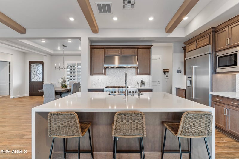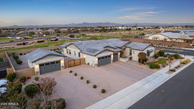 Listing details for 21036 Stacey Rd, Queen Creek, AZ 85142 : Designed for those who value refined living and intentional design, this exceptional Queen Creek residence is distinguished by elevated craftsmanship and unobstructed Superstition Mountain views from a premium oversized lot. The single-level layout is anchored by a gourmet kitchen featuring a commercial-style 48'' KitchenAid gas range and built-in 42'' KitchenAid refrigerator ideal for entertaining. A private attached casita with kitchenette, living area, bedroom, bath, and separate interior and exterior access adds remarkable flexibility. Your backyard paradise features a resort-style pool with waterfall feature, covered patio, and even room to build your own private pickleball court. A three-car attached garage is complemented by a detached two car garage with room for all of your toys!