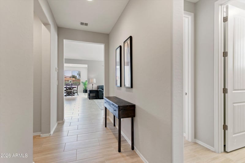 Listing details for 21107 267th Dr, Buckeye, AZ 85396 : THIS LIGHTLY LIVED IN, FURNISHED ODYSSEY MODEL, LOCATED IN A PRIVATE CUL-DE-SAC AND SIDES TO A COMMON AREA, IS A MUST SEE! This thoughtfully designed home offers an open-concept layout & effortlessly connects the living, dining & kitchen area, perfect for everyday living & entertainment. The chef's kitchen is a standout w/upgraded cabinetry, stylish granite, tile backsplash & center island w/seating. The inviting living & dining space is flooded with natural light. The spacious master bedroom features a walk-in closet & ensuite w/dual sinks & low threshold shower. The guest bedroom is complete with an adjacent full bath, perfect for visitors. Garage offers built in cabinets for additional storage. Relax outdoors on the extended patio overlooking a beautifully landscaped, private backyard.
