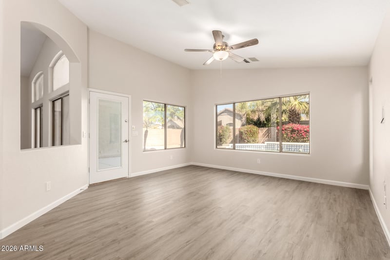 Listing details for 21110 Calle De Flores --, Queen Creek, AZ 85142 : Fall in love with this beautifully designed home. A 2-car garage welcomes you, and inside you'll find vaulted ceilings, wood-look floors, pre-wired surround sound, and expansive glass windows that bathe the space in natural light. Spacious living and dining area flows effortlessly into a welcoming family room perfect for everyday living or hosting guests. Chic kitchen shines with stainless steel appliances, quartz countertops, crisp white cabinetry, a center island with breakfast bar, and a walk-in pantry. Double doors open to the generous primary retreat, featuring a pristine bath with dual sinks, a soaking tub, and a walk-in closet. A sizable den offers flexibility for a home office or studio. Out back, unwind under the covered patio or cool off in the sparkling pool. Make it yours now!