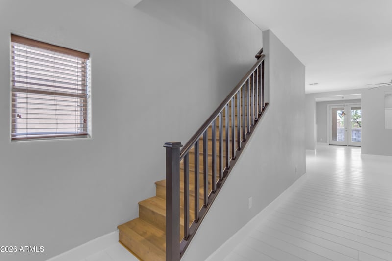 Inside, you will find white wood style flooring, soft neutral walls, tall baseboards, updated fixtures, and a staircase with a handrail that truly pops. The spacious family room flows into the eat in kitchen featuring white cabinets, stainless steel appliances, a pantry, and plenty of room to gather. Double French doors lead to the backyard where you can enjoy the extended paver patio, large covered patio, low maintenance artificial turf, and extra storage, creating the perfect space for relaxing or entertaining.
