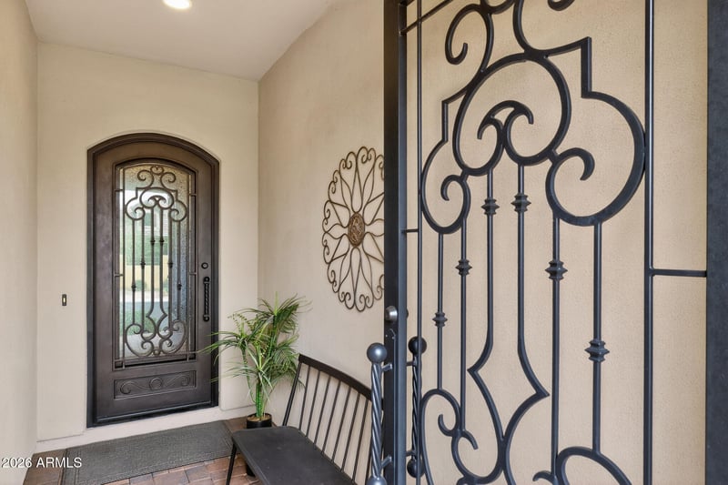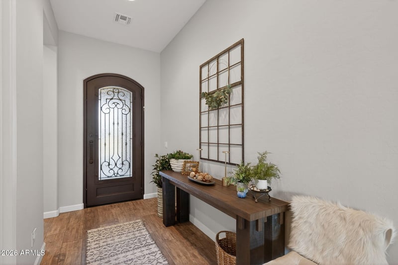 Listing details for 2113 Trowbridge St, Mesa, AZ 85207 : Entertainer's dream 3 bedroom, 2.5 bath home with seamless indoor-outdoor living in Sanctuary at Mountain Bridge. Open-concept design features custom finishes, abundant natural light, upgraded fixtures, and wood-plank tile flooring. Custom corner sliding doors connect living, dining, and backyard spaces. Gourmet kitchen with stainless steel appliances, granite countertops, cream cabinetry, and large island. Private primary suite with ensuite bath. Resort-style backyard with sitting area, built-in BBQ, heated pool and spa, turf, pavers, custom awning, and desert views.