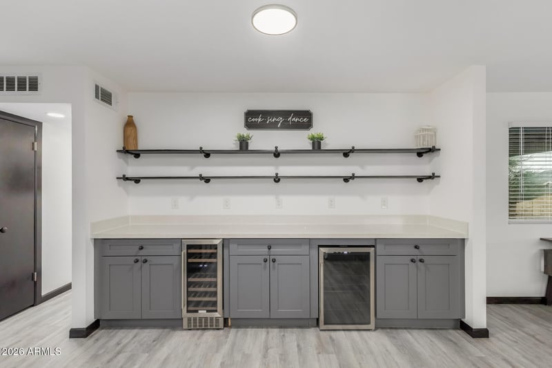 Listing details for 2117 Kimberly Way, Phoenix, AZ 85027 : Fully remodeled 4-bedroom, 2-bath home tucked away on a huge cul-de-sac lot! This stunning property features a brand-new kitchen with elegant quartz countertops, custom cabinetry, and not one but two wine fridges—perfect for entertaining. Both bathrooms have been beautifully updated with modern finishes. Enjoy luxury vinyl flooring throughout, dual-pane windows for energy efficiency, and an open, light-filled layout. Step outside to an expansive backyard oasis complete with a large sparkling pool and two covered patios, ideal for gatherings or relaxing evenings. This move-in ready gem combines style, comfort, and space in one incredible home!