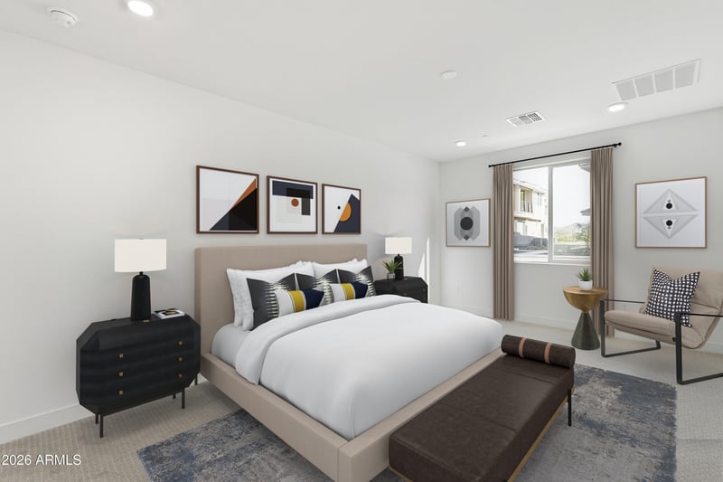 Listing details for 2121 Sonoran Desert Dr #79, Phoenix, AZ 85085 : Built by Toll Brothers, this move-in-ready Residence Four offers a bright, open-concept design with designer-appointed finishes throughout. The kitchen features two-tone cabinetry with a white perimeter and contrasting island, quartz countertops, a statement mosaic backsplash, and stainless Whirlpool appliances including a 36'' electric cooktop, wall oven, and hood. Warm luxury vinyl plank flooring and soft neutral tones create a welcoming feel. The primary suite includes cultured marble countertops and a beautifully finished bath. A tandem garage and generous storage complete this stylish home near community amenities.