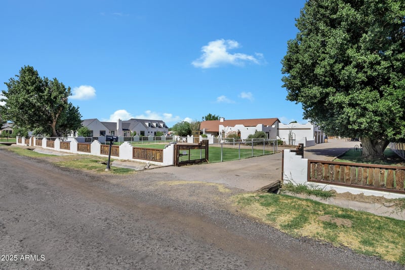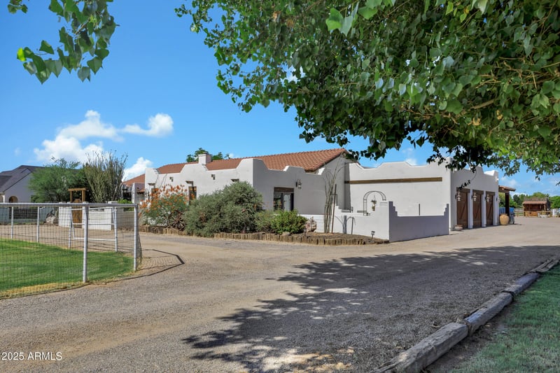 Listing details for 21230 156th St, Gilbert, AZ 85298 : Custom Santa Fe home - No HOA! - Front property with house only -- 1.6 irrigated acres on a County Island. Entire 2.76 available per MLS #6982091 at $2,225,000. This beautifully custom home offers the perfect blend of luxury, comfort, and functionality. A charming courtyard entry welcomes you to this spacious property, featuring a 4-bedroom, 4-bathroom main house plus a detached casita with private entrance--ideal for hosting guests or operating a home business. Designed with the chef in mind, the gourmet kitchen boasts a large island with prep sink, high-end natural gas stove, Cafe refrigerator, built-in microwave, under-counter refrigerator drawers, and exquisite two-toned custom wood cabinetry. Granite countertops, a farmhouse sink, travertine backsplash, and a generous walk-in pantry complete this culinary masterpiece with beamed ceilings. The great room stuns with vaulted ceilings, stone fireplace, offering an open yet cozy ambiance. Enjoy both an eat-in nook and a formal dining area for gatherings. Travertine flooring flows throughout the home, adding elegance and durability. Retreat to the guest suite with its own full bath and private entrance for added convenience.