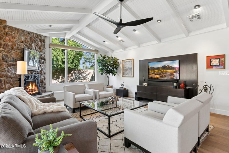 Listing details for 2140 Solano Dr, Phoenix, AZ 85016 : Redesigned mid-century craftsmanship in the heart of the Biltmore. Captivating at first sight, the striking curb appeal showcases rusted metal accents, ledger stone, and stained wood elements that create a timeless architectural statement. Thoughtfully enhanced over the years, this 3,296 sf residence offers 4 bedrooms, a dedicated den, and 3 baths, all situated on an expansive 14,527 sqft lot. Inside, the home blends warmth and sophistication with French oak wood flooring, beadboard ceiling accents, and timeless wood burning stone fireplace. The main living area is filled with natural light from expansive windows, creating a seamless connection between indoor and outdoor living. The spacious kitchen is designed for both everyday living and entertaining, featuring a large island with.... with granite countertops, abundant cabinetry, and premium Miele and KitchenAid appliances. A charming breakfast nook opens to the living area, while a formal dining room with a custom built-in adds an elevated touch for hosting.