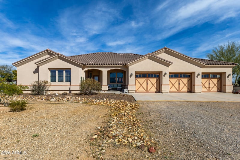 Listing details for 21404 Caravaggio Ln, Wittmann, AZ 85361 : Spacious custom home with dual primary suites and full private baths plus two additional bedrooms offering a shared bath. Open kitchen with granite countertops, large island, breakfast bar, breakfast nook, and formal dining area. Cabinets feature pull-outs, built-in pantry, and walk-in pantry for great storage. Large great room with pot shelves and architectural niches. Inside laundry with sink. Oversized 3-car garage (length and width) with a storage rooms and 220V. Covered patio overlooks fenced pool. Pipe fencing and cross-fenced areas ideal for horses or livestock. RV gate with full hookups including power, water, and dump. Mature citrus and fruit trees, desert views, and plenty of room for trailers, and true Arizona horse property living.