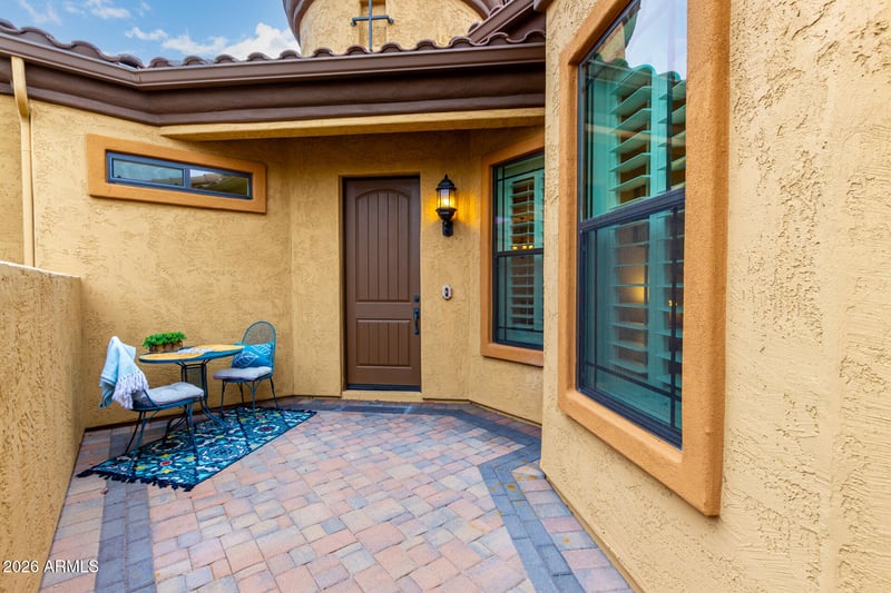 An oversized wall of glass opens to the backyard, creating an effortless indoor-outdoor space and providing the home with natural light. Step outside to a low-maintenance backyard designed for relaxation, featuring desert-friendly landscaping, a covered paver patio perfect for outdoor seating, and a firepit to enjoy Arizona evenings under the stars.