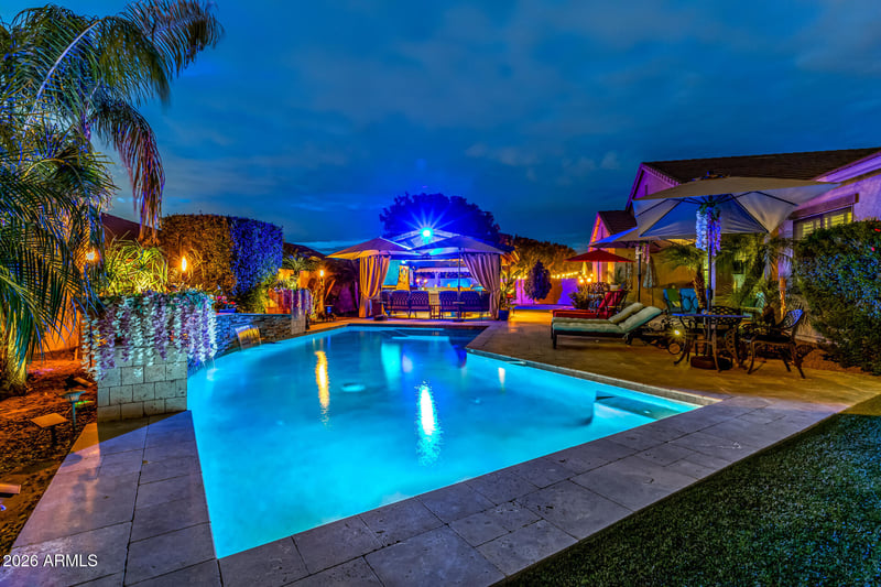 Listing details for 21504 193rd St, Queen Creek, AZ 85142 : Welcome to the ultimate entertainer's dream at Lucia at Queen Creek. This Courtyard 4 bed + office + theatre/3bath/3 car garage is perfectly positioned on a 14,530 sq-ft corner lot directly across from the park. This exceptional home offers oversized bedrooms, including a show-stopping primary suite with a 27-foot-deep closet and spa shower. The heart of the home boasts beautiful maple cabinets with extended cabinetry and counter space, plus a walk-in pantry that's as functional as it is impressive. Designed for both everyday comfort and unforgettable gatherings, Fitness enthusiasts will appreciate the dedicated fully equipped gym, a theatre room with all furniture and audio/video equipment conveying, and surround sound inside and out. Step outside to enjoy the sparkling pool and custom gazebo with heat, LED lighting and retractable awning making this home ideal for seamless indoor-outdoor entertaining.