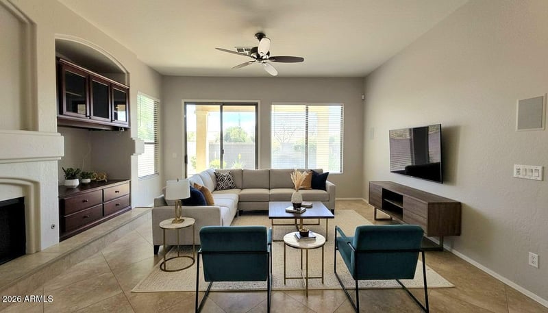 Listing details for 2153 Dublin Ln, Chandler, AZ 85224 : Location, Location, Location! Rare 3-car garage on this stunning single-level Fulton Home in the heart of Chandler! This spacious 1,855 SF beauty offers 3 bedrooms, a versatile den, and 2 bathrooms -- all on one level for effortless living. Soaring 10-ft ceilings, wide hallways, and an open floorplan create an airy, expansive feel, while neutral tones keep the space warm and inviting. Gorgeous large-format tile flows through all main living areas, with plush carpet in the bedrooms. The chef's kitchen is the heart of the home -- featuring brand new appliances, granite countertops, stone backsplash, tall cherry-finish cabinets, a large pantry with roll-out shelves, electric oven, and flat cooktop. Seamlessly open to the great room and formal dining room, it's an entertainer's dream. The den is perfect for a home office or hobby space. includes NEW KITCHEN APPLIANCES (4/2026) AND NEWER A/C (7/2024) AND Step outside to your private, grassy backyard with no neighbors behind the home -- your own peaceful retreat. Quick access to the 101 & 202 freeways makes commuting a breeze!
