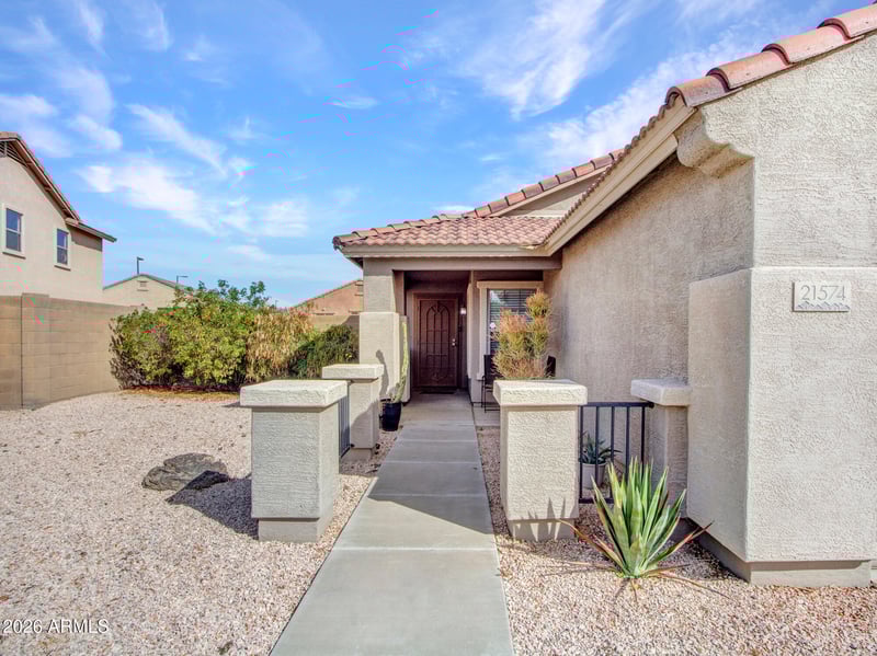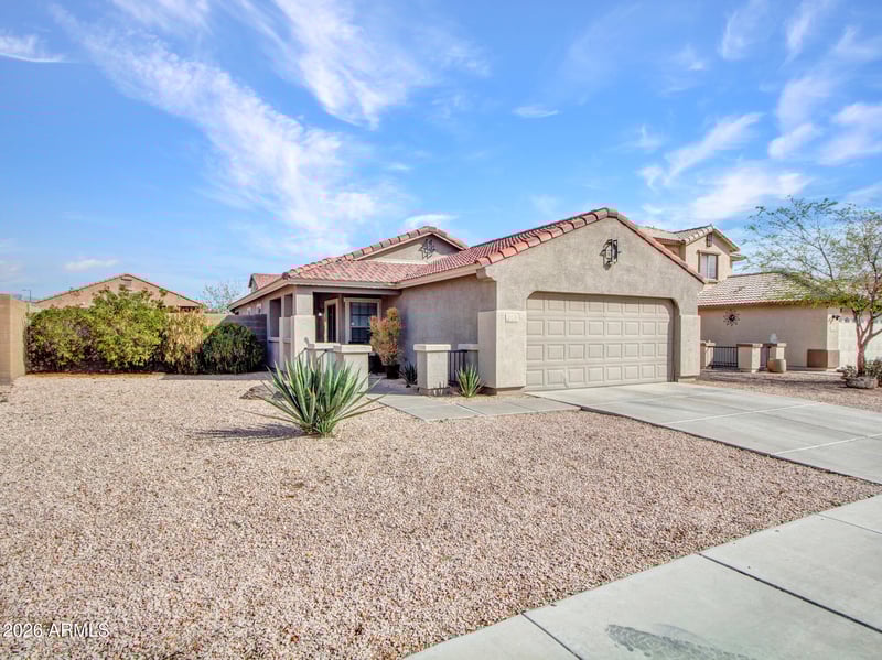 Listing details for 21574 Watkins St, Buckeye, AZ 85326 : Welcome to Sundance—an easy, comfortable place to call home. From the inviting front patio to the attached 2-car garage, this 3-bedroom home feels welcoming from the moment you arrive. Inside, the living space is calm & relaxed, with wood-look flooring, neutral tones, & plenty of natural light—perfect for unwinding after a long day. Eat-in kitchen is practical and bright, featuring white cabinetry, stainless steel appliances, and a pantry. Primary bedroom offers a quiet retreat with soft carpeting, a spacious closet, and private bath with dual sinks. Large backyard has covered patio and grass. Truly a wonderful home.