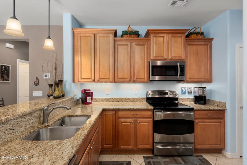 Listing details for 21613 261st Ave, Buckeye, AZ 85396 : PRICED TO SELL! THIS CHARMING SPIRIT MODEL FEATURES A 10/23, 16 SEER HVAC SYSTEM & RADIENT BARRIER INSULATION PROVIDING MAJOR COST SAVINGS!! This 1375 SQ FT, 2/2+den home lives large! The interior boasts an inviting living space w/lots of natural light & diagonally set tile and carpet in all the right places. The dine in kitchen is nicely equipped w/staggered honey glazed maple cabinets, granite counters, SS appliances & breakfast bar. Large owner's suite has adjoining bath w/dual sinks, step in shower & walk in closet. Light bright 2nd bed and den w/closet which can easily be converted to a 3rd bedroom. Enjoy outdoor living on your extended, covered patio, overlooking your beautifully landscaped, private, walled back yard. All this and more, located in this amazing 55+ community!
