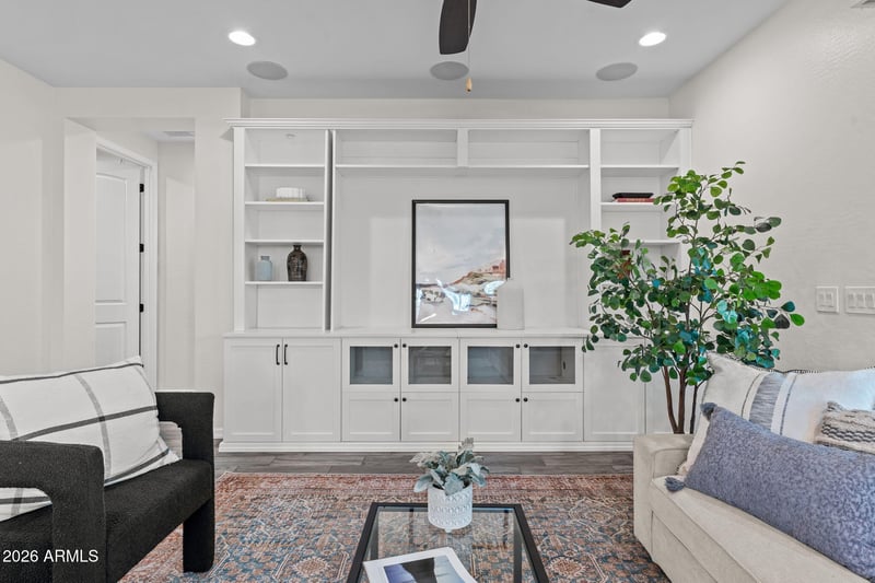Listing details for 2167 Osborn Ln, Gilbert, AZ 85295 : Imagine coming home to sunshine, space, and the vibrant lifestyle of Cooley Station--just steps from the community park & amenities + moments from all the new shopping, dining, and entertainment at Verde. Perfectly positioned on the largest corner lot in the neighborhood, this beautifully updated home offers the best of comfort and connection. Mornings might start with a walk to the aquatic center for a swim, afternoons at the park or pickleball courts, and evenings spent exploring nearby restaurants before returning to your own private retreat. From the moment you step through the oversized front door, wood-look tile floors guide you through bright, open living spaces designed for gathering. The kitchen is the heart of the home, featuring a large island, granite countertops, gorgeous cabinetry, and an oversized walk-in pantry. It flows seamlessly into the living area with a modern built-in entertainment feature. The thoughtfully designed layout includes a downstairs guest room & private primary suite with a beautifully upgraded tile shower, dual shower heads, dual vanities, and a spacious walk-in closet. Upstairs offers three additional bedrooms, a sleek bathroom, and a versatile loft that opens to a walk-out balcony. Step outside to your own backyard oasis with putting green, real grass, citrus trees, fire pit, and dual sliding doors that create effortless indoor-outdoor living. With a paver driveway, RV gate, and unbeatable location, this is more than a home--it's a lifestyle.