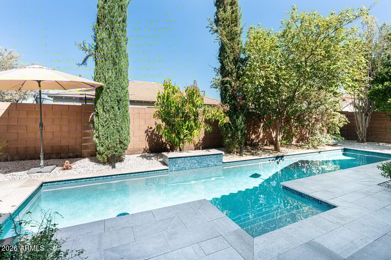 Step outside and you'll find a 36' x 6' lap pool installed in 2024, perfect for starting the morning with energizing laps or unwinding with a peaceful evening swim. Surrounding the pool, lush landscaping creates a private and inviting atmosphere where Arizona outdoor living truly shines. Just steps away, a pergola with fan and lighting offers a shaded retreat -- the perfect place to relax with a good book, host friends, or simply enjoy the beauty of the backyard oasis.