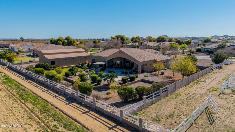 Listing details for 21816 Pegasus Pw, Queen Creek, AZ 85142 : WOW! Stunning custom estate on a full acre in gated Pegasus Airpark with airpark privileges and exceptional garage space. Includes a 1,686 sq ft detached RV/TOY garage with motorized roller gate and 10' & 14' doors, plus a 950+ sq ft 3-car garage. The RV/TOY garage also features a 243 sq ft guest suite with full bath, perfect for visitors, hobbies, or a private office. Inside, the immaculate open floorplan showcases travertine tile, rich Alder cabinetry, 8' solid-core doors, and soaring 10'-12' ceilings. The dramatic island kitchen boasts granite countertops, gas cooktop, wall oven, microwave, and new built-in stainless refrigerator. The spacious primary suite offers generous closet space, a jetted tub, and a separate walk-in shower. *HIT MORE* Step outside to a true backyard oasis with mountain views. Travertine decking covers the resort-style backyard pool area and covered patio, a sparkling diving pool, rock waterfall, and a gazebo with BBQ and bar seating, all surrounded by lush landscaping. Three large secondary bedrooms provide flexibility; two with walk-in closets and share a convenient Jack-and-Jill bath, while the third features a closet and double doors off the entry area, making it perfect as a bedroom or office adjacent to the master suite. Additional highlights include abundant storage, water softener, central vacuum, and alarm system. Immaculate and move-in ready, this home delivers luxury living with unmatched garage space and exceptional outdoor entertaining.