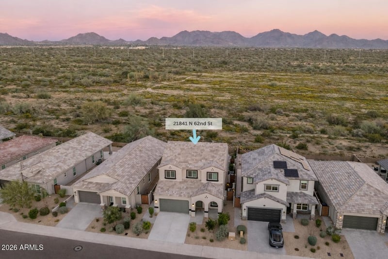 Listing details for 21841 62nd St, Phoenix, AZ 85054 : This stunning 2024-built home showcases the popular DR Horton ''Crow'' floor plan in the highly coveted Talinn community, one of the premier neighborhoods in Desert Ridge. Perfectly positioned on a premium view lot backing pristine state land, the property offers unobstructed desert privacy and breathtaking McDowell Mountain views. The east-facing backyard captures spectacular Arizona sunrises and glowing mountain sunsets and is designed for true resort-style living. Enjoy a newly installed heated pebble tec pool and spa with Pentair automation, in-floor cleaning, custom gas fire pit, view fencing, a private side patio with tranquil fountain, Rachio smart irrigation, and Sunbrella outdoor furnishings. Inside, this 4-bedroom plus den/office home is loaded with upgrades and smart-home features, including a Rinnai tankless water heater, Envirotec water softener, reverse osmosis system, Cox fiber internet, ADT security with Google Home integration, Google doorbell and cameras, Z-Wave smart controls, Hunter ceiling fans, Sonance in-ceiling speakers, stainless steel appliances, Electrolux washer and gas dryer, mounted TVs, and a two-zone HVAC system. The epoxy-coated 3-car tandem garage is equally impressive, featuring a side-by-side refrigerator and two NEMA 14-50 outlets for Level 2 EV charging.