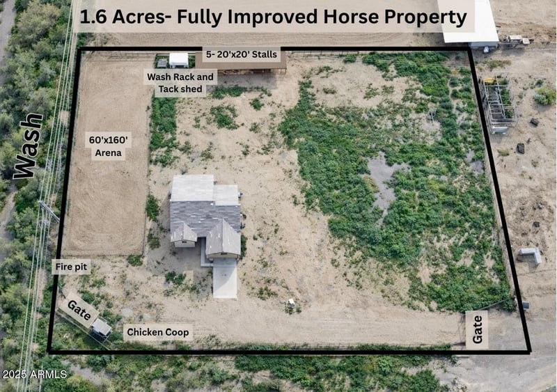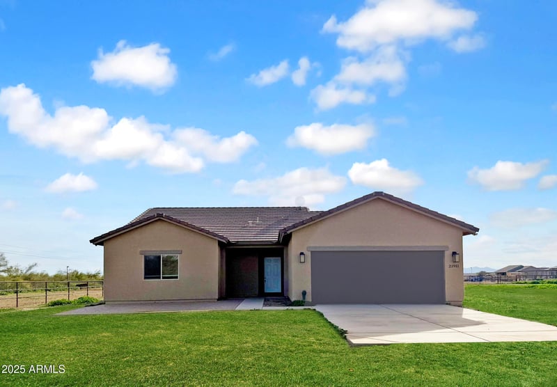 Listing details for 21911 Duane Ln, Wittmann, AZ 85361 : Incredible opportunity to own a highly improved horse property at an exceptional value. Tastefully built in 2021 with a modern touch and tile throughout, this home is privately situated at the end of a cul-de-sac with no neighbors on two sides, offering the perfect blend of comfort, privacy, usability, and space. The grounds feature over $50,000 in fencing, multiple access gates, five shaded stalls, a separate arena with solar lights, wash rack, hay/tack shed, custom chicken coop, and a cozy fire pit. Ride directly out the back gate onto dirt trails. All appliances convey. Enjoy peaceful rural living while staying close to city convenience — just 10-15 minutes to Surprise, with easy 303 access, and 25-30 minutes to Goodyear. Incredibly priced and an outstanding value!