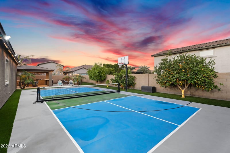 Listing details for 21960 Russet Rd, Queen Creek, AZ 85142 : This stunning resort-style home in Queen Creek, Arizona (Crismon Heights community) delivers the ultimate luxury Arizona living experience with an attached guest suite/casita featuring a separate entrance--perfect for multi-generational homes, extended family stays, guest accommodations, or added privacy and versatility in Queen Creek homes with casita. The open-concept interior boasts soaring high ceilings, durable tile flooring throughout, expansive 16' multi-slide doors that seamlessly connect indoor and outdoor spaces, and a cozy built-in electric fireplace in the living room for year-round warmth and ambiance. The gourmet kitchen features upgraded cabinetry with custom built-ins, an oversized granite island, and a large walk-in pantry--ideal for effortless entertaining and daily family life. The bedroom layout offers excellent flexibility: a Jack and Jill bathroom shared between two bedrooms (with dual access doors for convenience and privacy), plus a spacious additional bedroom featuring a large room size, generous walk-in closet, and its own private bathroom--great for kids, guests, or a home office/teen suite. Your private backyard oasis is designed for relaxation and fun: a massive 30,000-gallon saltwater pool with captivating fountains and a spacious baja step for easy lounging; a fully equipped ramada with built-in kitchen, gas grill, and outdoor fireplace; a separate pergola for versatile shaded outdoor living; lush landscaping providing shade, privacy, and tranquility; low-maintenance professional artificial turf that eliminates yard work in Arizona's heat; professional permanent outdoor lighting boosting curb appeal, security, and evening ambiance; a large side yard with an RV gate for added flexibility; and a dedicated pickleball court (or multi-sport court) ready for active play--perfect for families seeking Queen Creek homes with a pickleball court or Arizona homes with a sports court. Located in prime Queen Creek AZ, this luxury home is minutes from the Legacy Sports Facility, AZ State Route 24, top-rated schools, restaurants, shopping, grocery stores, San Tan Mountain hiking trails, parks with pickleball courts, and endless entertainment, offering the balanced, family-friendly desert lifestyle everyone wants.