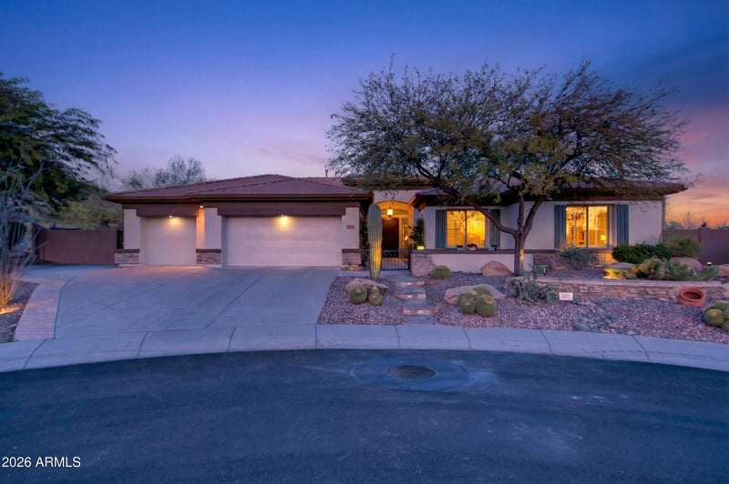 Listing details for 2201 Hazelhurst Ct, Anthem, AZ 85086 : View this Wonderful Amherst model situated on a beautiful oversized mountain view lot at the end of a quiet cul-de-sac and conveniently located mid way between both clubhouses! Featuring 4 bedrooms, 3.5 baths and a den with custom built-in desk and cabinetry, this 3737 sq. ft. home is highlighted by new interior and exterior paint, 12' ceilings, 3 car garage and upgrades throughout. Stepping into your outdoor living space you are greeted by Stunning Daisy Mountain views and a natural desert wash. The oversized pie shaped lot affords 3 separate entertaining areas....a soothing inground Shasta spa, lush mature landscaping, custom hardscape, covered patio, outdoor kitchen, sitting area around gas fireplace and automated awning. Enjoy the Anthem Country Club lifestyle.....Welcome Home!