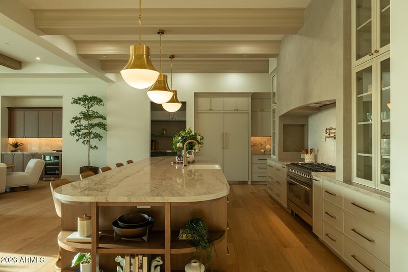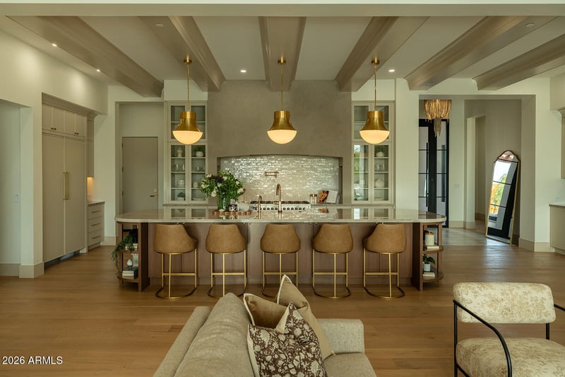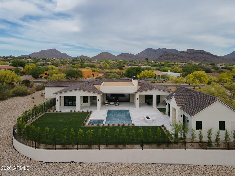 Listing details for 22012 Los Caballos Dr, Scottsdale, AZ 85255 : Brand-new construction in the prestigious Los Gatos community of Scottsdale, this exceptional estate offers 5,432 SF of refined living on a sprawling 1.3-acre lot. Developed by A/M Living and design from Kozi Designs, this thoughtfully designed split floor plan features a 4 bed, 4.5 bath main residence plus a private 1 bed, 1 bath guest house--ideal for visitors or multigenerational living. Luxurious finishes shine throughout with accents of stone, beams, and plaster, creating a warm, organic aesthetic. Enjoy resort-style outdoor living with a pool, spa, and phenomenal landscaping. An oversized 4-car garage with 12' ceilings provides ample space for vehicles, storage, or lifts.