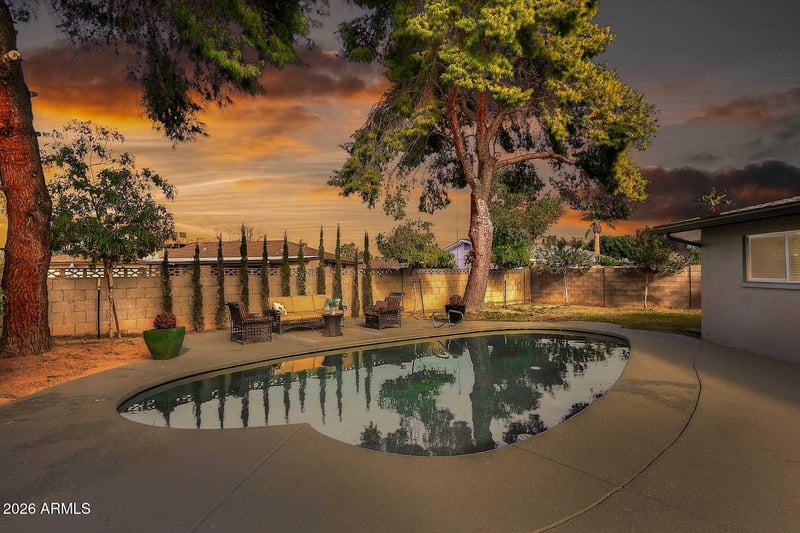 Listing details for 2204 Dartmouth St, Mesa, AZ 85213 : Stunning! This 4br / 2ba Mid-Century Modern sits on a cul-de-sac, w/ lovely front porch. Great Entertaining Home w/Privacy & Beautiful Curb Appeal. Seller spent $100K on this full remodel, including Permitted 300sf Addition (bedroom/den/office), & 2-Car Garage supervised by ROC# Contractor. Private Side Entrance for Home Business - Home-School, Construction, Accounting Office, etc... Oversized Parking Area to accommodate up to 6 Vehicles. Light & bright interiors w/ White Chef's Kitchen w/ 8' Center Island. Open Great Room/ DR w/ 12' Patio Slider overlooking Parklike Backyard. 9' Raised Flat, Drywalled Ceilings w/Recessed Lighting Throughout. Pebble Diving Pool w/ Custom Child-Proof Cover. Backyard has over 1,000sf of Pool Decking & 3 Patio Areas. HURRY! This one won't last!!