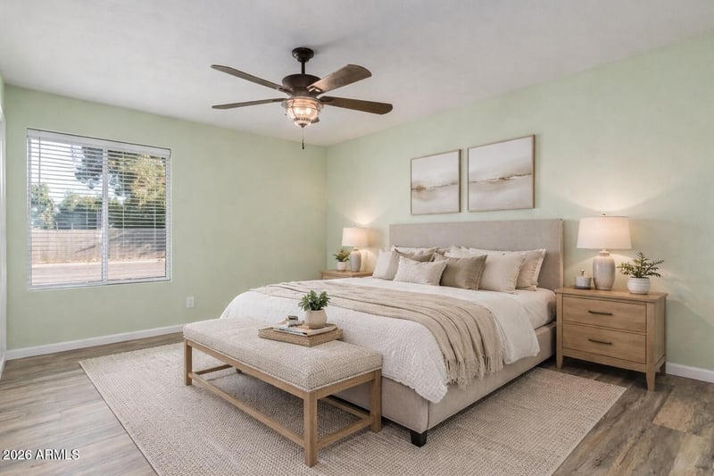 Listing details for 2215 Straford Dr, Chandler, AZ 85224 : Seize the chance to own this charming 2-bedroom, 2-bath home with no HOA! You're welcomed by a delightful living room with a soothing palette, recessed lighting, blinds, and wood-look flooring for a timeless appeal. The well-appointed kitchen features granite counters, wood cabinetry, a tile backsplash, stainless steel appliances, a handy pantry, and a peninsula with a breakfast bar for quick meals. The primary bedroom includes a private bathroom and a walk-in closet for keeping an organized wardrobe. Spend relaxing outdoor moments with loved ones in the lovely backyard, offering a covered patio, stylish pavers, a storage shed, lush natural turf, and a fragrant citrus tree for Mediterranean charm. Don't miss out on this fantastic opportunity!