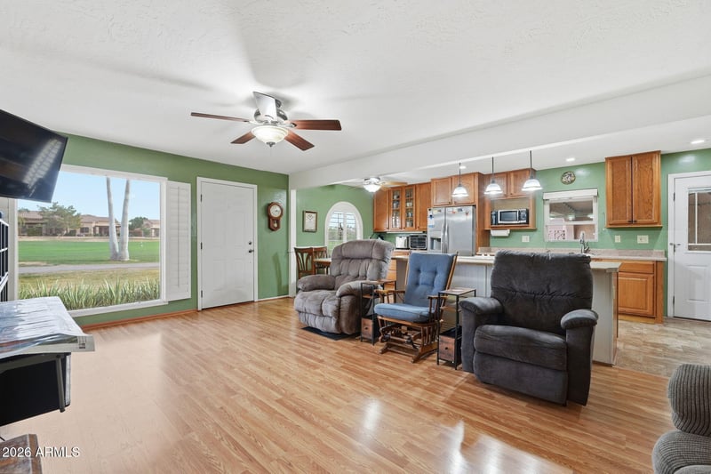 Listing details for 2217 Recker Rd, Mesa, AZ 85215 : Enjoy golf course living without the upkeep or membership fees. This 2-bedroom, 2-bath townhome sits directly on the Painted Mountain Golf Course, offering wide-open views that feel like a private, oversized backyard—without the maintenance. Impact-resistant windows are designed to handle the occasional golf ball, providing added peace of mind.