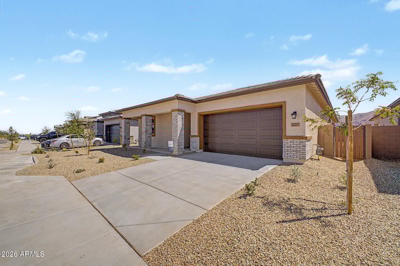Listing details for 22207 Tonopah Dr, Surprise, AZ 85387 : THIS unbelievable price IS RIGHT! Beautifully designed home. The kitchen and living area are perfect for entertaining. This home features 42'' white cabinets with brushed nickel hardware, granite counters in kitchen, stylish herringbone backsplash, GOURMET kitchen with gas cooktop, wall oven, designer hood, upgraded GE appliances. Huge island, breakfast bar, white composite sink. Butler's kitchen, big pantry, pendant lights too. Upgraded square sinks, 10' ceilings, 5'' baseboards, tankless water heater, smart home package. Primary suite has a flex room, primary bath shower is tiled to ceiling. Second flex room can be formal dining or office. Secondary bedroom with ensuite. Three car tandem garage, back patio is great for enjoying outdoor living. This Estates home can be yours!