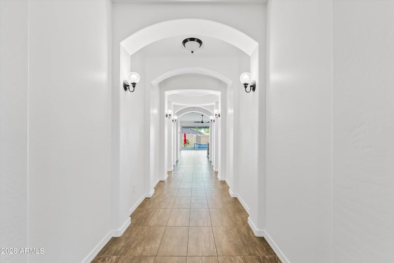 Listing details for 22218 Cherrywood Dr, Queen Creek, AZ 85142 : YOU FOUND YOUR NEW AT-HOME RETREAT in the heart of Queen Creek! This 3 bedroom, 2.5 bath home in La Sentiero is loaded with upgrades, making it THE BEST option for a 3 bedroom home in QC! The fresh coat of paint inside created a clean, blank canvas, ready for your personal touches! No boring rock is ruining this curb appeal, just an extended paver driveway and beautiful green turf welcoming you home every day. Inside, you'll find arched windows with plantation shutters and a rotunda entry that makes a statement before you even step inside. Stepping into the open great room, the full wall-length glass slider is the show stopper. You get a true indoor/outdoor experience that is difficult to find in this price point. The kitchen is a standout, featuring antique white raised-panel cabinetry, granite countertops, subway tile backsplash, double wall ovens, and an oversized island with pendant lighting. The primary bath boasts a floor-to-ceiling subway tile walk-in shower and matte black hex floors, while the powder bath has its own vibe with a sage green shiplap accent wall. Your new backyard has it all: a sparkling pool with dual waterfall features, travertine decking, a covered extended patio matching the length of your oversized slider, an above-ground hotter, more lucious green turf and mature palms. Come see this one before it's too late!