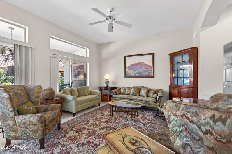 Listing details for 22307 Venado Dr, Sun City West, AZ 85375 : Beautifully expanded Chandler model on an exceptional cul-de-sac lot—nearly 1/3 acre! Original owners added a stunning 378 sq ft family room, creating wonderful space for everyday living and entertaining. The expansive backyard is an entertainer's dream with three patios, built-in grill, soothing fountain, and mature trees and flowering plants that bloom each spring. An inviting kitchen features a breakfast nook, gas range, two pantries and abundant storage. Private office included. Primary suite offers a bay window, dual closets including a walk-in, and spacious bath with granite counters. Guest bath also features granite. Whole-house soft water system and new HVAC in 2025. Lovingly cared for, and offering space, privacy, and the best of 55+ resort-style living in Sun City West, AZ!