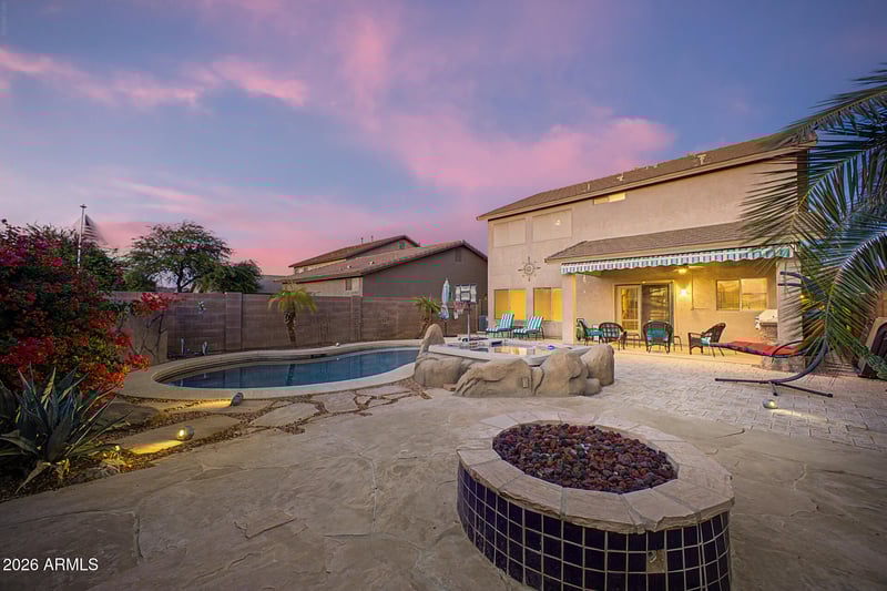 appliances, stacked cabinets, walk in pantry and a cozy family room, den and formal living and dining areas. New AC and whole home water system. Out back, escape to your own resort-style oasis complete with a heated pool, spa, built-in BBQ, fire pit, newer electronic patio shade with lights for additional shade! Low maintenance and beautiful! This home is perfect for entertaining! Must see!! Enjoy the added bonus of a community lake, parks and a pool just moments away.