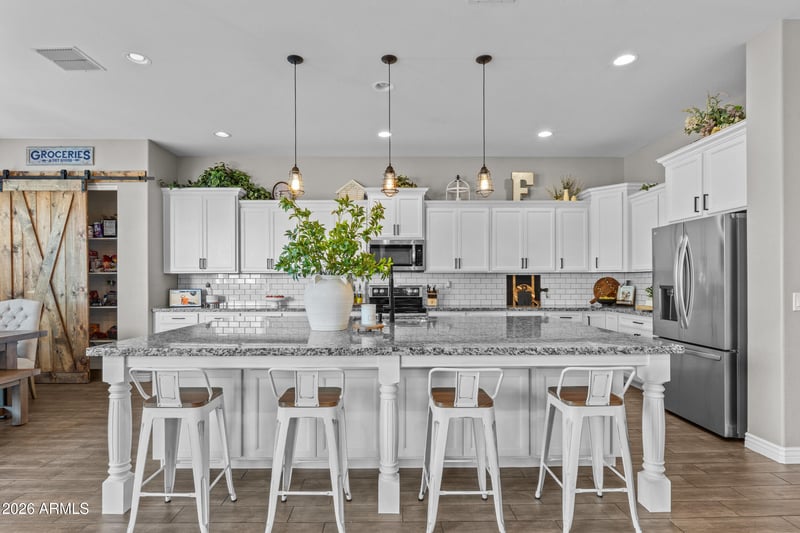 The open great room flows seamlessly into a well-appointed kitchen featuring white cabinetry, stainless steel appliances, multiple ovens, a large center island, and a spacious pantry, ideal for both everyday living and entertaining. Brand-new light fixtures add a fresh, modern touch throughout the home. Large sliding doors enhance the connection to the backyard, creating an inviting indoor-outdoor lifestyle.