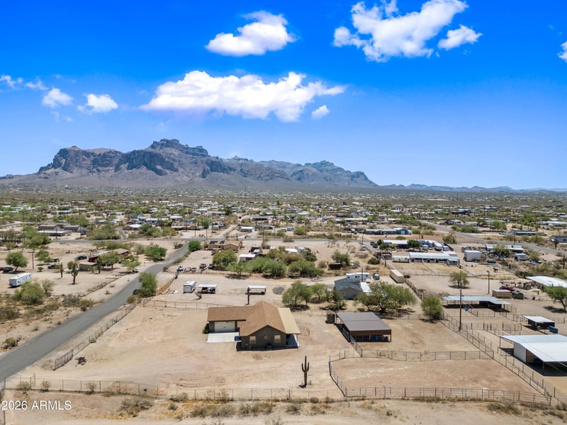 Listing details for 2235 Cody St, Apache Junction, AZ 85119 : Welcome to this gorgeous 2020 built, 1748 Sq Ft, 3 Bedroom, 2 Bath Gem on 1.25 acres, a 4 Stall Mare Motel, Stunning Mountain views and NO HOA!! Step inside and you will be greeted with the open great room and Kitchen featuring crown molding throughout, two toned paint, new window and door shades and neutral wood look flooring throughout the home, a grand kitchen island with light quartz countertops and breakfast bar, recessed lighting, walnut cabinets with silver pulls, SS appliances, built in microwave, tasteful glass tile backsplash, pantry, dining nook and a large built in buffet with a subway tile backsplash and upper and lower cabinets perfect for extra storage. The primary boasts an oversized walk-in shower with tile surround, glass doors, a sitting bench, two separate vanities, walk-in closet, water closet and a door leading to the side/backyard. On the opposite side of the home is the two secondary bedrooms and bathroom presenting a shower/tub combo with tile surround and glass doors. The large laundry room features upper cabinets, a sink and an extra storage area. The show stopper of this beauty is the 1.25 acres boasting a new mare hotel equipped with 4, 16x16 covered stalls, fencing on the majority of the property, ample space for all of your toys and the breathtaking views of the Superstition Mountains!