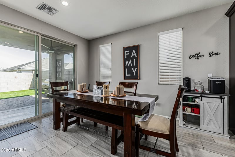 Listing details for 22438 Camina Plata St, Queen Creek, AZ 85142 : You must see this beautiful home in Meridian! From the great curb appeal and attractive desert landscaping to the covered porch and unique architectural style this home is a one of a kind. From the front door, this captivating open floor plan features tall ceilings, tile flooring, a light gray palette, recessed lighting, and tons of natural light. The modern, airy layout is perfect for both relaxing & entertaining guests. The kitchen offers generous storage, 42'' upper cabinets, sleek granite countertops, SS appliances, and an island. The primary suite boasts a bathroom with a dual granite vanity, oversized shower, and walk-in closet. The garage features epoxy flooring. Enjoy the backyard, complete with a large covered patio, pavers, and artificial turf. As a Meridian resident, you'll have access to the pool, playgrounds, parks, and basketball courts. Don't miss the chance to make this stunning home yours.